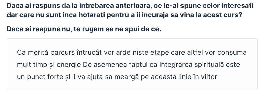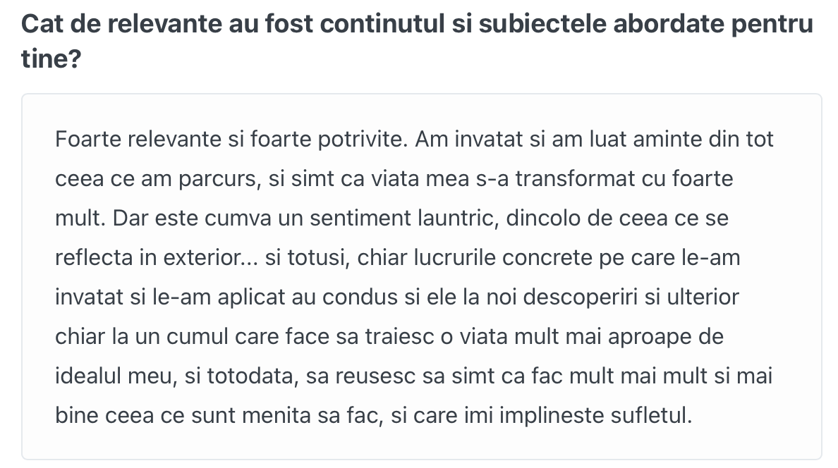 "In primul rand este un program care iti ofera sansa de a fi integrat intr-un grup unitar care urmareste, sub indrumarea mentorului sau, alinierea vietii profesionale cu cea spirituala intr-un mod care sa iti aduca foarte multa fericire si in care intreaga ta activitate profesionala sa fie continuu infuzata de tot ceea ce esti si cunosti din punct de vedere spiritual. Acest curs te ajuta sa iti spiritualizezi viata intr-un mod in care diferenta dintre viata de pe izopren sau paturica de meditatie si restul vietii tale se dizolva intr-un tot unitar si o comuniune mai profunda si mai continua/constanta cu Dumnezeu. Totodata, este un curs care te sustine si te incurajeaza sa cauti si sa identifici in profunzimile sufletului tau care sunt calitatile si inzestrarile tale exceptionale si apoi iti ofera mijloacele practice si sustinerea necesara pentru a reusi chiar sa si aduci la suprafata aceste comori din adancul fiintei tale, si sa le faci accesibile si altora, spre a se bucura si ei de bogatiile tale launtrice, si odata cu aceasta, si tu vei descoperi ca viata poate fi traita intr-un mod care sa iti aduca fericire in mod continuu."