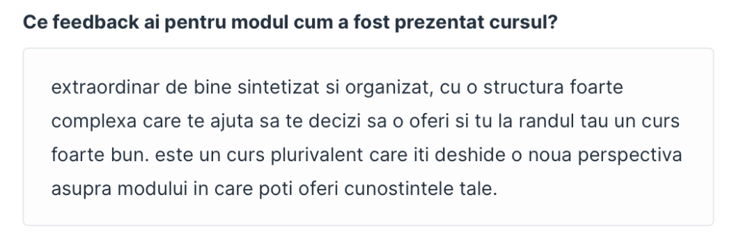 "Participând la cursul oferit de Integral Studies Academy despre Începutul Carierei Mele de Succes în Educația Online am avut stări sufletești frumoase, posibilitatea de a mă transformă rapid, de a mă îmbogăți lăuntric, de a face un curs integrat din punct de vedere spiritual care să îmi ofere perspective deosebite de dezvoltare și de împlinire lăuntrică într-un domeniu care este de un cert viitor și care oferă posibilități extraordinare. Văd acest curs că pe o șansă deosebită și minunată pentru mulți colegi și prieteni care încă nu și-au găsit o împlinire plină de succes, mulțumitoare, în mediul social, profesional în care să se îmbine armonios și principiile spirituale esențiale." Doctor Psihiatru - Lector Ayurveda, România