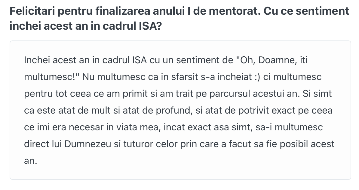 "Simt susținerea Ghidului Spiritual, a lui Dumnezeu în acest an de mentorat. Felul în care sunt integrate și susținute activitățile este deosebit de frumos, învăț din modul cum primește fiecare direcția necesară și în același timp învăț și ce îmi este mie util și simt că sunt susținută să fructific tot ce ni se oferă în acest cadru" Instructor și Director, Scoția